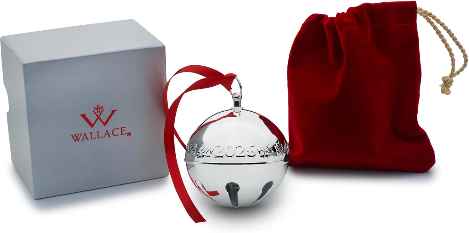 The Wallace Sleigh Bell is the 55th Edition Ornament in this collection. This silver plated bell has a center banner embossed around the 3" bell of beloved cardinals and beautiful poinsettias. The year 2025 is found in the center of the bell. The 2025 Wallace Silver Plated Sleigh Bell is an original work of art created by Wallace, one of America's premier silversmiths. The Wallace Sleigh Bell is handcrafted in silver plated and made in the United States. This collectible, 55th edition ornament is a perfect memento, and a wonderful way to continue a holiday. This ornament will arrive with ribbon, velvet pouch and is nicely gift boxed.